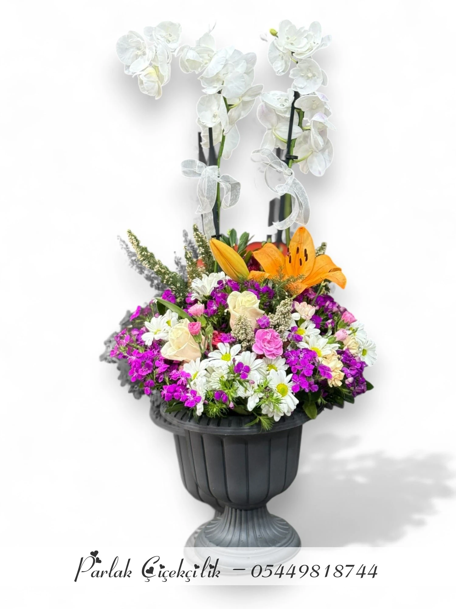 Zarif beyaz orkideler, canlı turuncu lilyumlar, pembe güller ve mor papatyalarla buluşarak büyüleyici bir görsel şölen sunuyor. Siyah klasik ayaklı saksı içinde hazırlanan bu özel aranjman, hem şıklığı hem de canlı renkleriyle bulunduğu ortama zarafet katıyor. Açılışlar, tebrikler veya sevgi dolu sürprizler için eşsiz bir seçim. Ürün Detayları: 2 dal beyaz Phalaenopsis orkide Turuncu lilyum, pembe gül, beyaz papatya ve mor kır çiçekleri Büyük boy plastik saksı içinde aranjman Ortalama yükseklik: 70-80 cm Açılış, kutlama ve kurumsal gönderimler için ideal İstanbul geneli hızlı teslimat ve taze çiçek garantisi